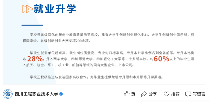 四川工程职业手艺大学则是有60%以上的结业生都能进入航空、航天、军工、核工业、船舶等范畴的国有大型企业和上市公司工做。