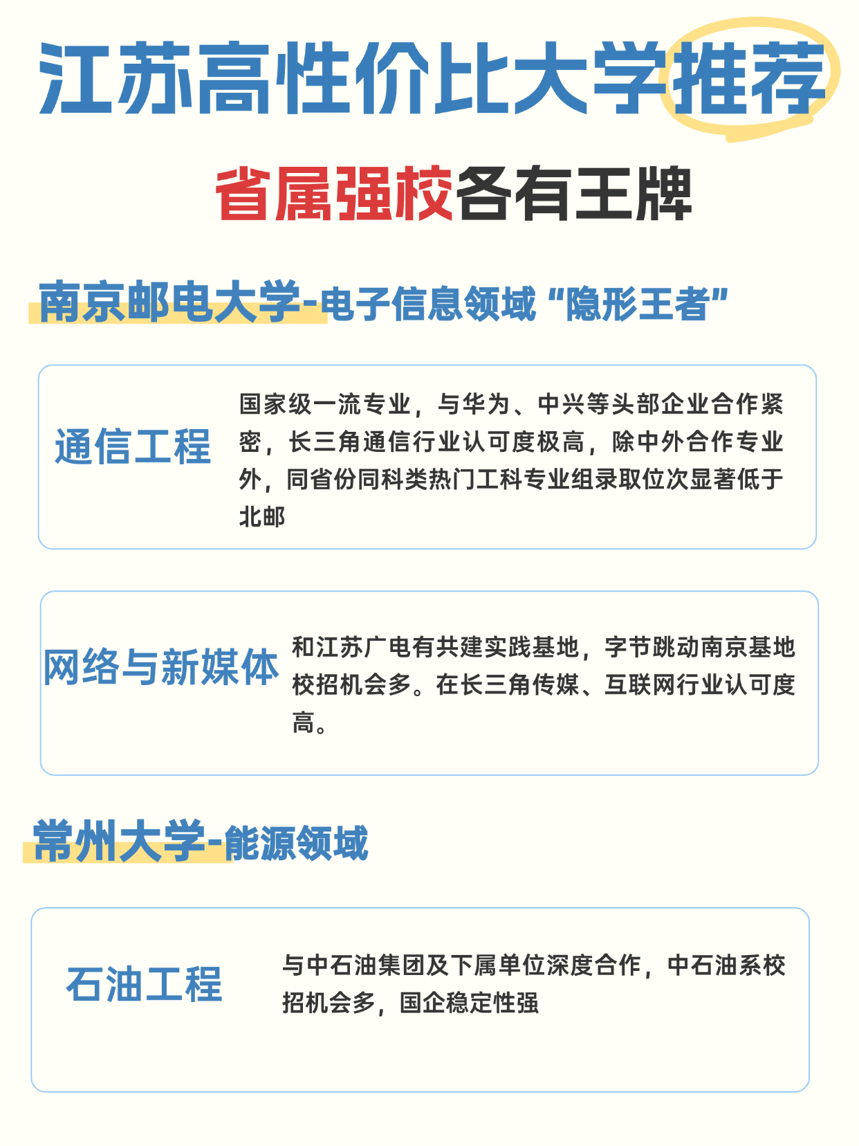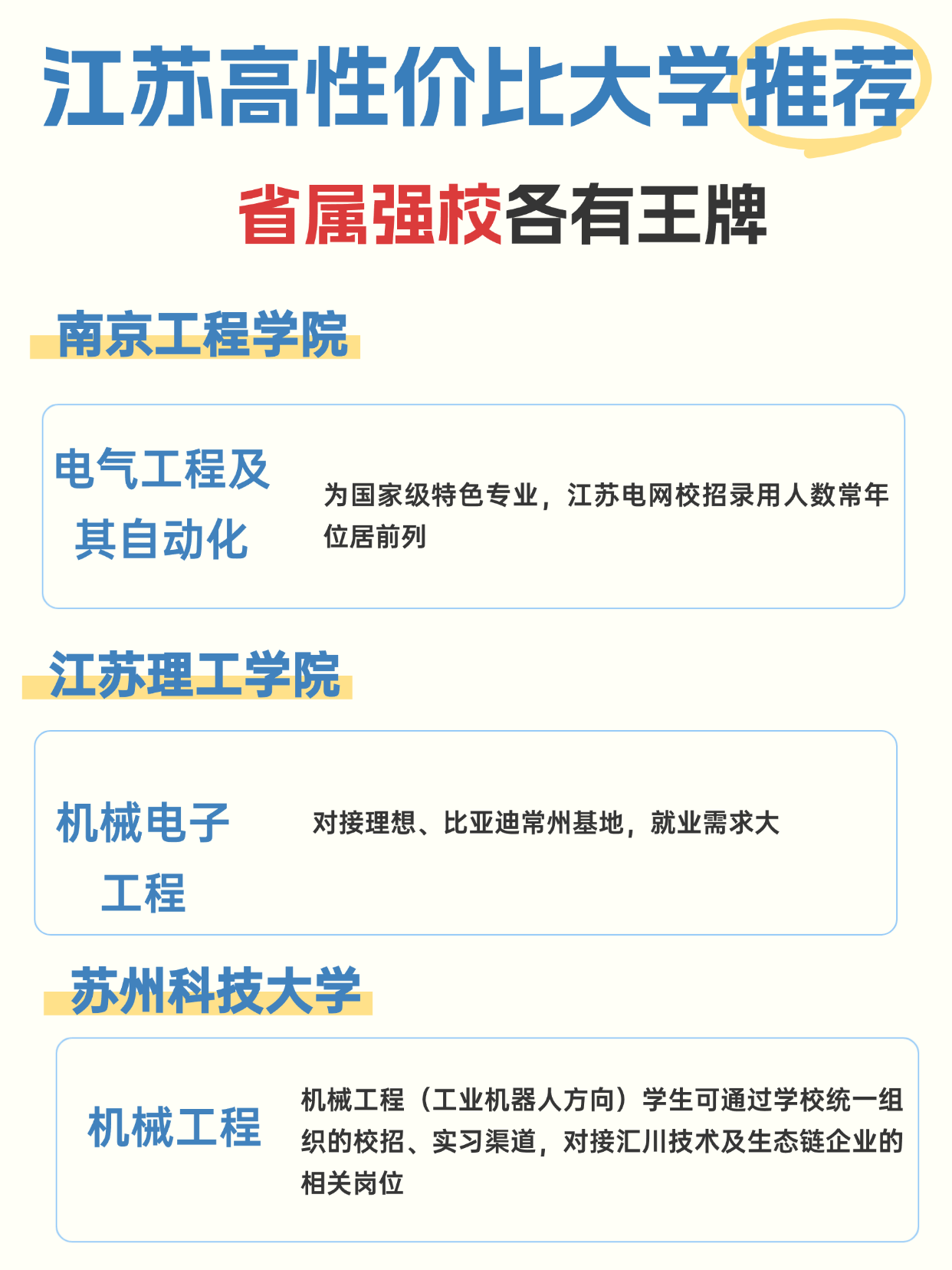 提到江苏高校,良多人只晓得南大、但对大都考生来说,这些省属强校才是 的宝藏之选!江苏的省属高校深耕当地财产几十年,和龙头企业绑定慎密,笼盖理工、财经、医学等抢手范畴,家长和考生赶紧珍藏! 全国独一以审计为特色的高校,审计学受四大会计师事务所青睐;(经济法标的目的)正在长三角金融法务范畴合作力强 机械工程(工业机械人标的目的)学生可通过学校同一组织的校招、练习渠道,对接汇川手艺及生态链企业的相关岗亭 温暖提醒:本文内容拾掇自公开教育平台、高校官网及行业报道,具体以各高校发布的就业质量演讲为准,仅供意愿填报参考。金榜是一款高考意愿填报指点系统,为高考生供给新高考选科和高考意愿填报主要数据筛选查询,输入诊断成就/日常平凡成就/高考分保举适合的大学和专业,为高考考生意愿填报方案评估把关。